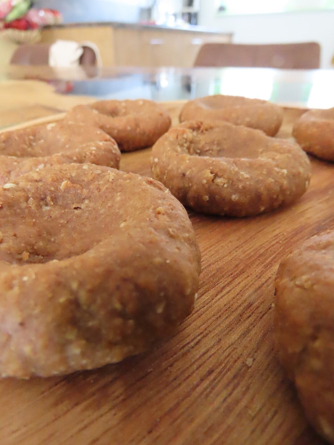 -Rol het deeg in balletje van ongeveer 3 cm doorsnee en druk deze plat op een bakplaat met bakpapier (tot ongeveer 1 cm dikte). Als je een vulling wil toevoegen maak dan in het midden een kuiltje.